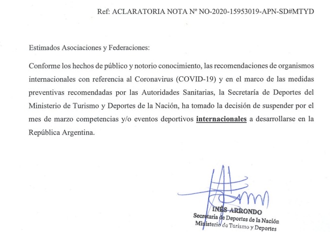 Fue necesario explicar que la medida alcanza a los eventos y competencias internacionales únicamente que se desarrollen en el territorio argentino