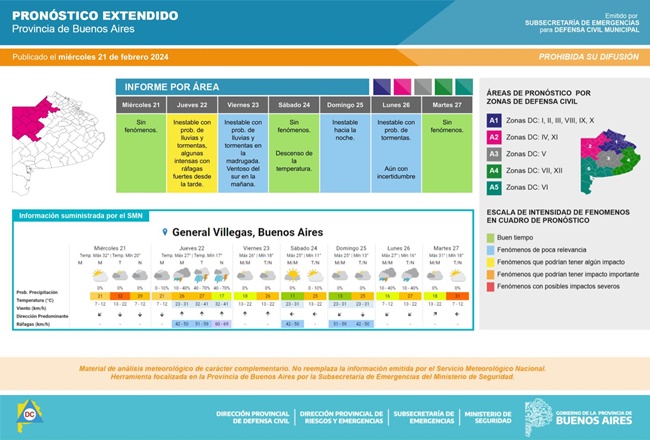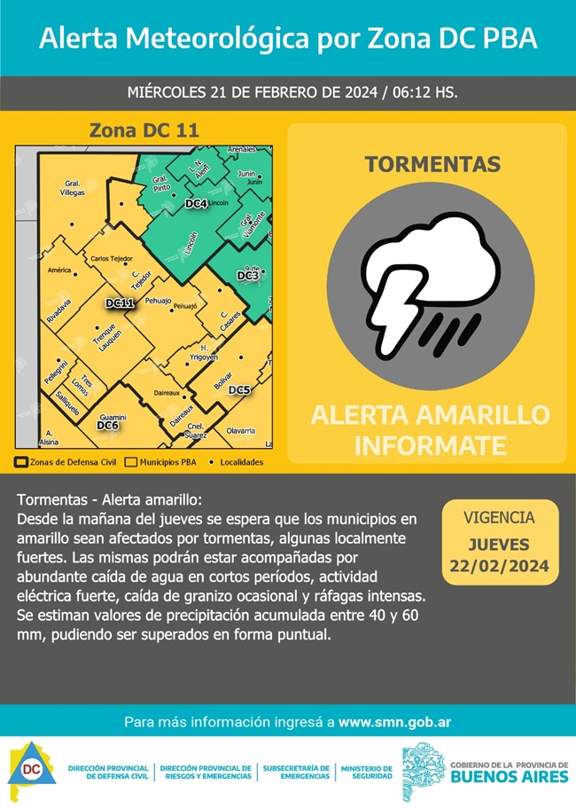 Las tormentas llegarán al centro, oeste y sur bonaerense. Alcanzarán a los municipios de Florentino Ameghino, General Pinto, General Villegas, Rivadavia, Bolívar, Carlos Casares, Carlos Tejedor, Hipólito Yrigoyen, Pehuajó, Adolfo Alsina, Daireaux, Guaminí, Pellegrini, Salliqueló, Trenque Lauquen y Tres Lomas.