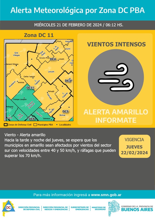 Los vientos se sentirán en la zona norte y centro del territorio bonaerense y abarcarán a Alberti, Bragado, Chivilcoy, General Viamonte, 9 de Julio, 25 de Mayo, Florentino Ameghino, General Pinto, General Villegas, Rivadavia, General Alvear, General Belgrano, General Paz, Las Flores, Lobos, Monte, Navarro, Roque Pérez y Saladillo.